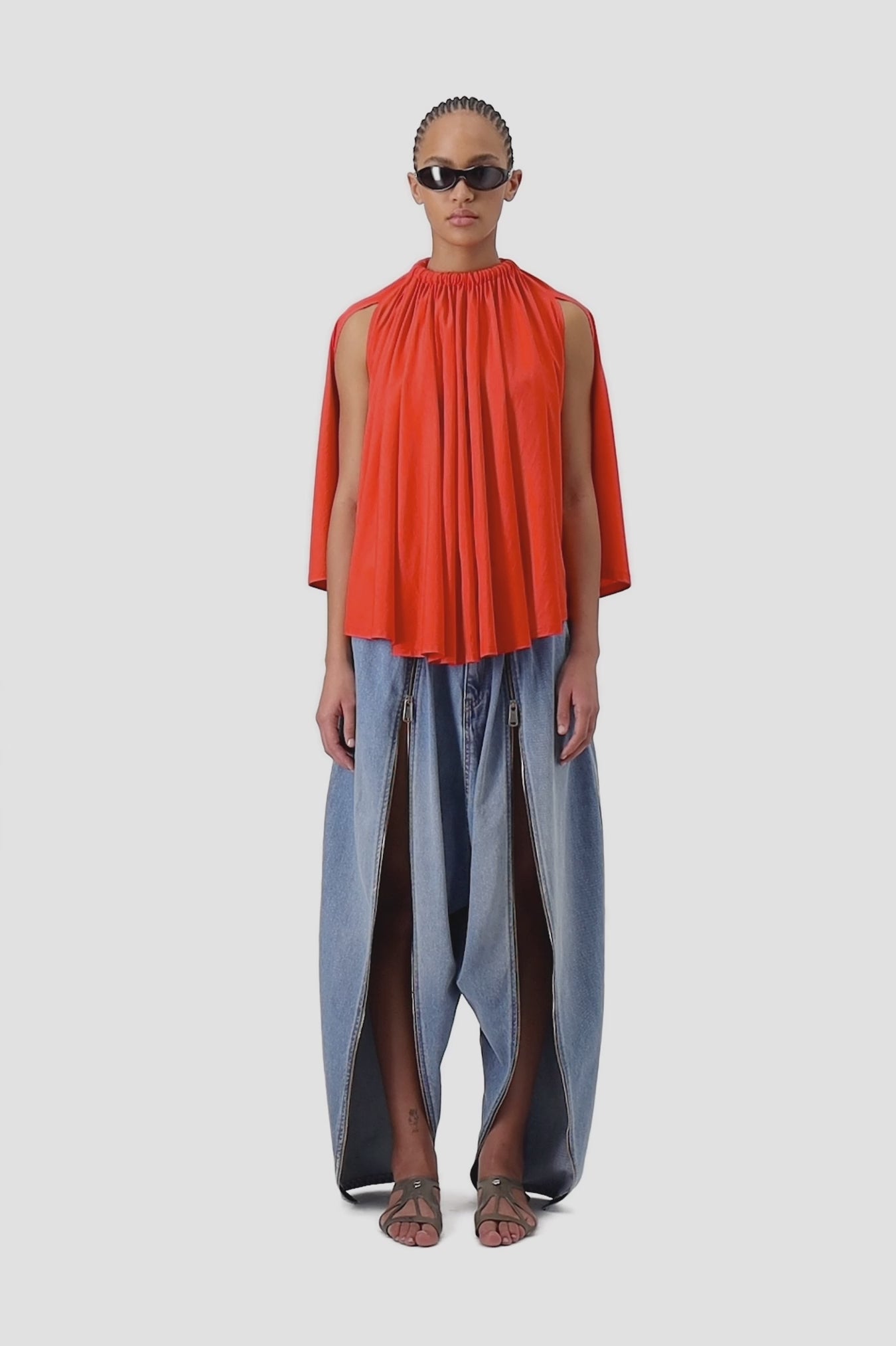 The circular cut and asymmetric line create a soft drape, preserving the fluidity of the design. The modal fabric enhances the smooth flow of the piece. The construction remains minimal, letting the red tone and the geometric cut work together to define the overall look.